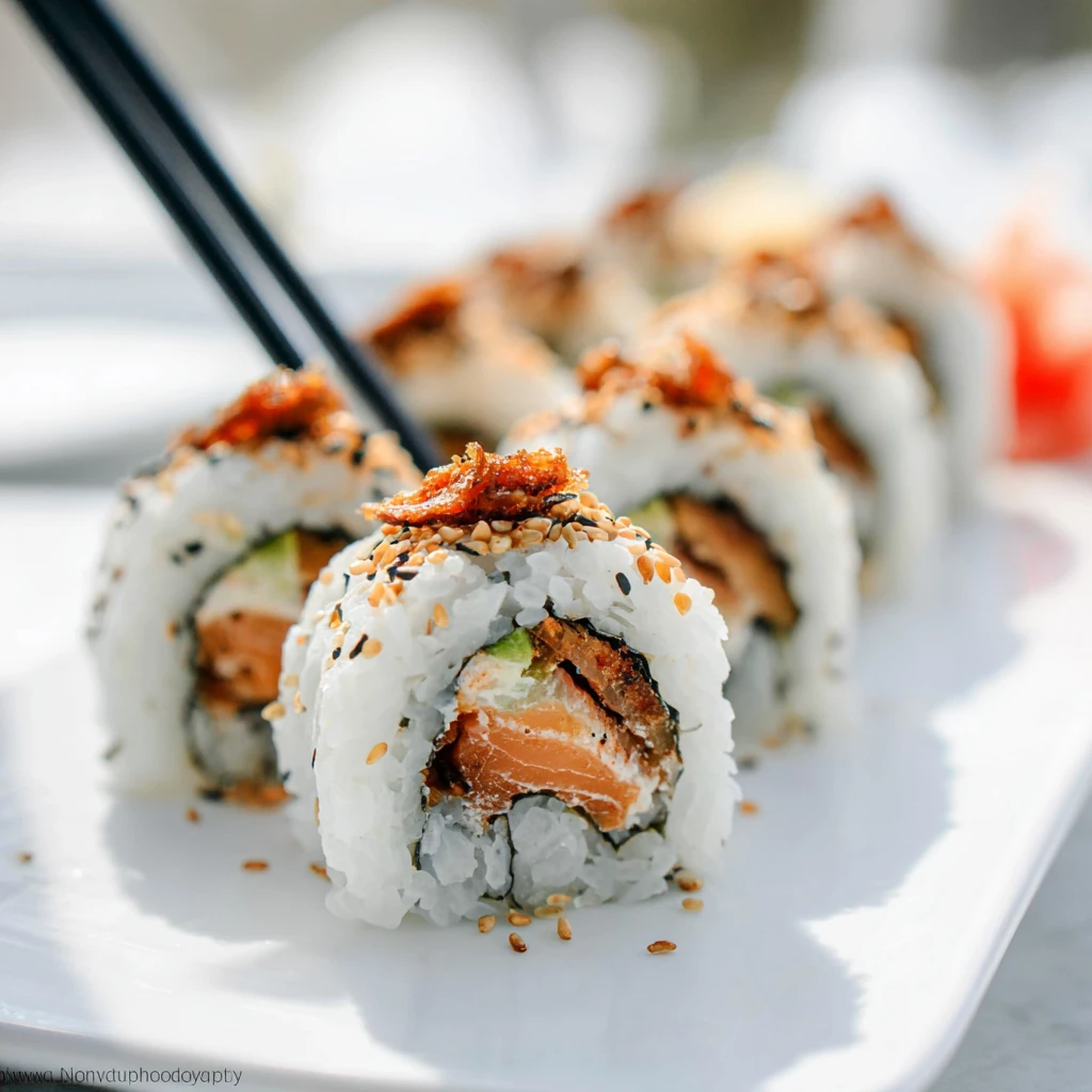 The Salmon Skin Roll is a sushi lover’s favorite, combining crispy roasted salmon skin, creamy avocado, fresh cucumber, and a touch of sweet-savory eel sauce. Wrapped in seasoned sushi rice and nori, then sprinkled with sesame seeds, this roll delivers a delightful contrast of textures and bold flavors in every bite.